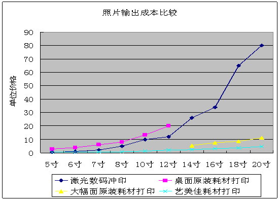 從上圖就可以看出,照片打印機(jī)和基于照片打印的多功能打印機(jī),每年都以30%以上的速度增長(zhǎng),僅美國(guó)市場(chǎng),2005年預(yù)計(jì)裝機(jī)量就達(dá)到2000萬(wàn)臺(tái)以上,2008年可達(dá)3000多萬(wàn)臺(tái)。 相比于數(shù)碼激光,照片的噴墨打印輸出至少有如下優(yōu)勢(shì):方便、隨意性強(qiáng):因?yàn)橥耆诩彝?、辦公室實(shí)現(xiàn),可大可小、可多可少,隨時(shí)隨地、隨心所欲。私密性好:用不著將數(shù)碼文件交給別人,也用不著從他人處取回,不想讓人見(jiàn)的,別人永遠(yuǎn)見(jiàn)不到。DIY,樂(lè)趣無(wú)窮:不管是對(duì)于專業(yè)人士,還是對(duì)于數(shù)碼發(fā)燒友,完全可以陶醉于從拍照、編輯修改到打印輸出的無(wú)窮樂(lè)趣。環(huán)保:不再用銀鹽等稀缺資源,也擺脫了藥水使用與排放對(duì)于環(huán)境的污染。持久不退色:噴墨打印墨水分為染料和顏料兩大類,如果使用顏料墨水打印出的照片,比傳統(tǒng)的銀鹽感光照片能夠保存更長(zhǎng)的時(shí)間而不退色。 噴墨打印技術(shù)不斷發(fā)展,墨水和打印介質(zhì)品質(zhì)也在不斷提高,從技術(shù)的角度來(lái)看,水性顏料墨水+RC間隙型防水高光相紙是照片噴墨的主流方向。不但質(zhì)感、影像品質(zhì)方面毫不遜色于銀鹽感光照片,而且在光線耐牢度、方便性、設(shè)備投入等方面明顯優(yōu)于感光照片。 可能唯一的問(wèn)題是成本,有的人會(huì)抱怨,噴墨打印的成本高,是的,以EPSON照片級(jí)噴墨打印機(jī),打印在原裝EPSON高質(zhì)量光澤照片紙上為例,打印一張6寸的照片,成本會(huì)在3元以上,而在外面的沖印店里,激光數(shù)碼沖印的報(bào)價(jià)只有一塊左右。定位于專業(yè)應(yīng)用的大幅面打印機(jī)打印(24英寸到44英寸寬)成本會(huì)低很多,因?yàn)樽烂娲蛴C(jī)墨盒中的墨水,平均每毫升價(jià)值10塊人民幣左右,大幅面打印機(jī)墨盒的容量更大,平均每毫升2元上下。從下圖就可以看出,用專業(yè)大幅面打印機(jī)打印照片,成本就已經(jīng)遠(yuǎn)遠(yuǎn)低于激光數(shù)碼沖印的價(jià)格,但是這些打印機(jī)并不是給家庭使用的,像激光數(shù)碼沖印一樣,是給專業(yè)的影像服務(wù)機(jī)構(gòu)使用的。